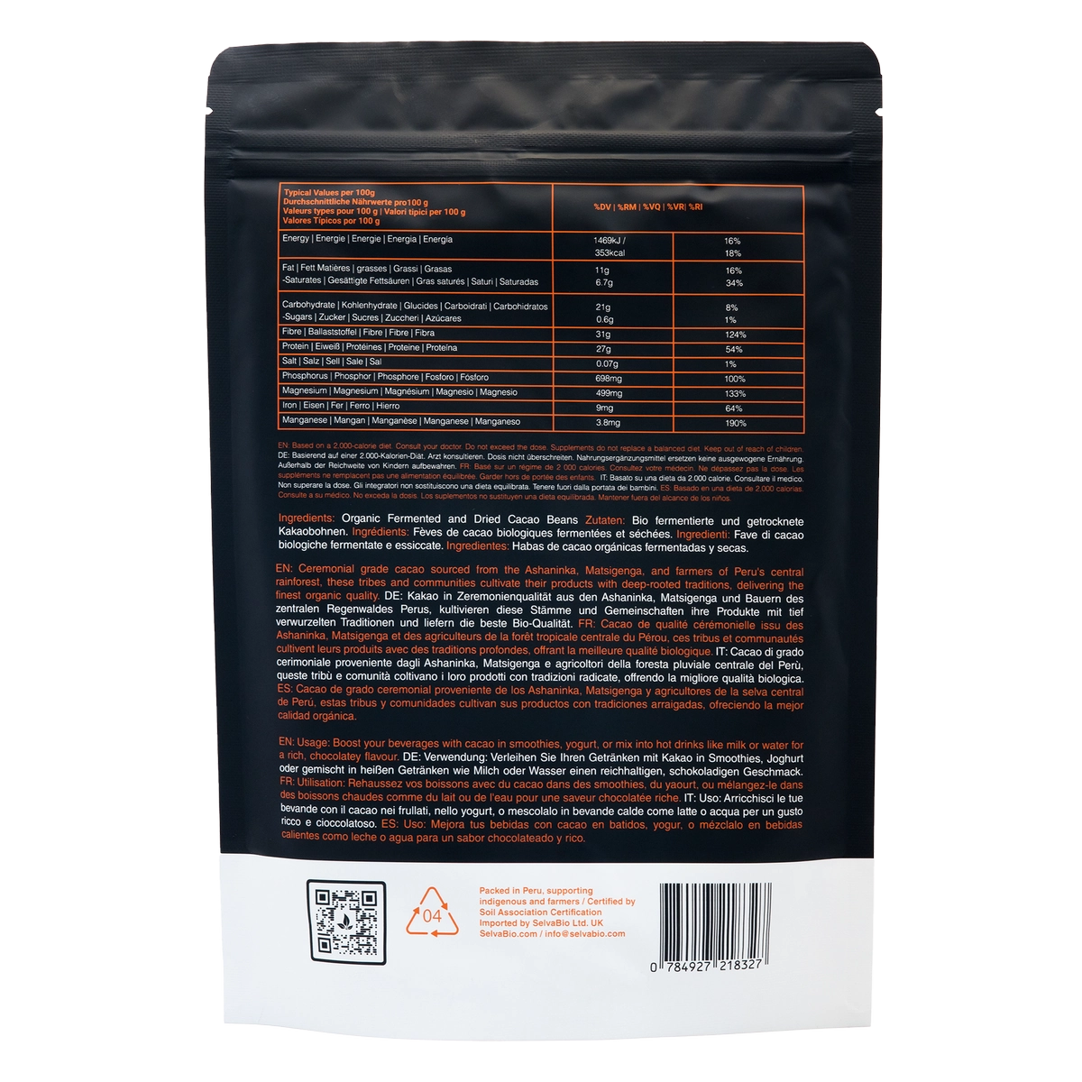 Instantáneo y fácil. Nuestro Cacao orgánico en Polvo es la versión pulverizada del Cacao Ceremonial orgánico de SelvaBio que viene en trozos. Esto permite que un producto sea instantáneo y fácil de preparar, produciendo un chocolate caliente que además de ser crudo y libre de aditivos o azúcar, es altamente beneficioso y una gran fuente de nutrientes, minerales y vitaminas esenciales.